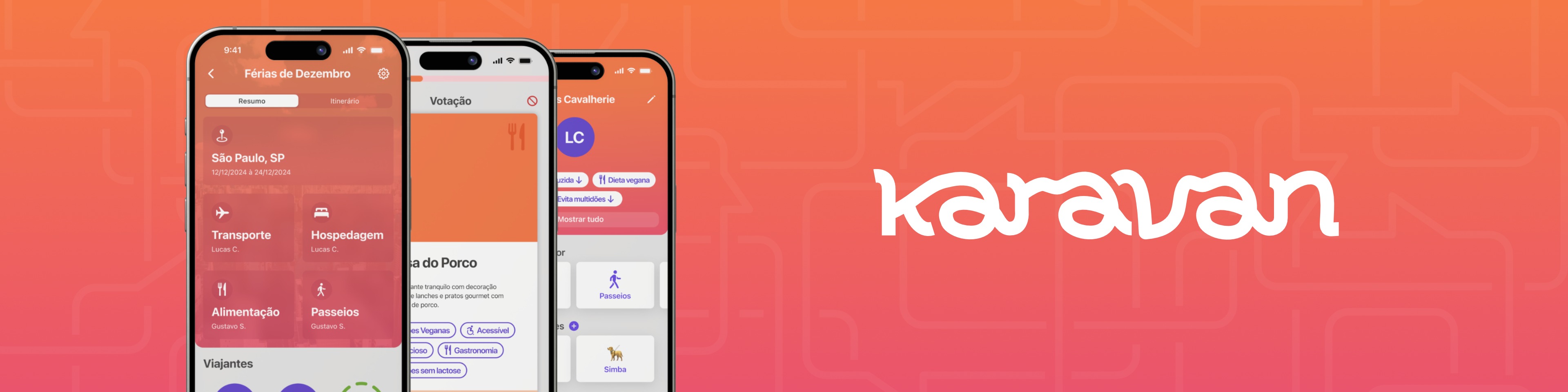 Essa escolha foi estratégica para dialogar tanto com a persona identificada no projeto, principalmente mães que costumam organizar as viagens, quanto com outros viajantes que não lideram o planejamento, como filhos e amigos. A identidade precisava equilibrar acolhimento e leveza para conversar com esse público mais jovem, geralmente mais aberto a testar novos aplicativos e atuar como early adopters. O nome Karavan reforça a ideia de grupo em movimento, enquanto as cores quentes e a wordmark com letras mescladas simbolizam proximidade e união.